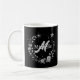 Ett elegant silver och vitt monogram på en rik svart bakgrund omgiven av stjärnor och blommor.