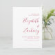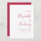 Det här enkla men djärva moderna bröllop spara datum-kortet har magenta i snyggt handskriftsalternativ och sans serif-teckensnitt, justerat med högerna mot en vit bakgrund. Kortets baksida är en solid magenta.