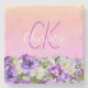 En elegant gräns av violett, lavendelfärgad färgad, lila och vita vattenfärgade rutor på en rosa och persikofärgad färgad. Anpassa och lägg till ditt monogram brev, initialer och namn, vit och lila färgad brev, handskript för stil.