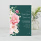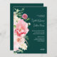 Den här eleganten framträder grönt och mörk för rosa blommigt moody bröllopsinbjudan har rosa-blommor, grönska, vackra manuskript för snyggt, kalligrafi på en rik och moody bakgrund. Den här inbjudan är perfekt för paret att ha bröllop på en romantisk, formell, elegant, modern, chic, sofistikerad, trendig, trädgårdsäsong eller bröllop-plats utomhus.