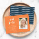 Stilfull inbjudan till examensfest med foto med ditt foto i en vit ram och "Grad Party" i modern text mot en orange bakgrund på framsidan och ett blått och vitt randigt mönster på baksidan.