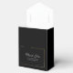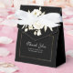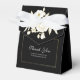Den här elegantens svarta favoritruta gör att dina gäster känner sig speciella. Ditt vita skript Tack och meddelande accentueras av en klassisk guld och vit blommigt bukett med guld ram. Baksidan har parets namn med samma ram och blommigt accent.