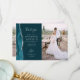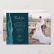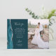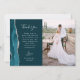 Skicka ett speciellt bröllop-tack till din familj och dina vänner med de här anpassningsbarna. Högerna har ett lodrät-foto. På den lämnat visas ord "tack" i elegant silver grått-handskriftsformat typografi på en mörk tealblå bakgrund över ett kort, redigerbart tack till dina bröllop-gäster i typsnitt, med namn nedan. En tårblått vattenfärgagat gräns som trimmas med faux silver glitter dekorerar det lämnat kant. Baksidan ger utrymme för ett andra vågrät-foto.
