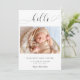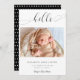 "Hej" i elegantens skriptteckensnitt med finare-dekorationer. Ett enkelt och elegant foto på baby födelsemeddelande. Modern, minimalistisk och ren stil. Baksidan har söt polka dots mönster.