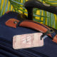 Girly roligt modern bagagetagg i penseldrag med ro guld, glitter, svart och adorberad med ditt skript monogram, först namn och början.