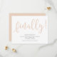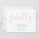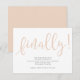 En roligt bröllop spara datum-annoucement med texten "finally!" i ord i fet stil och party i moderna sans serif-teckensnitt. Texten (inklusive "finally" i ord) och färg i bakgrunden kan redigeras genom att klicka på "anpassa ytterligare"