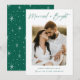 Firar din första jul som gift par med vårt gift och ljusa helgdag-fotokort! Kortet har "Gift och ljus" i ett handskrivet, modernt skript med grönt. Ditt foto från bröllop visas med ett vitt, grovt kant gräns. Anpassa kortets framsida genom att lägga till en anpassningsbar hälsning med namn som visas nedan. Kortet återgår till visning med en grönt bakgrund med en vit mousserande stjärna mönster.