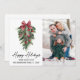 Modern Elegant Calligraphy Bläck Script Watercolor Tallar Winter Grey med Burgundy Red Ribbon Bow jul Ornaments, Gräs Cones och Holly Berries Photo Glad helg Card