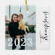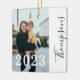 Minimal och modern icke-traditionell julprydnad med en enkel och modern design med ett familjefoto och ett skript i familjen trendig namn. Fotoövertäckning i fet år. Den omvända sidan har ett andra foto.