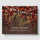 Elegant guld kalligraphy-skript gäst bok med rustik twinkle ljus, mason burk med vita blommor (på baksidan) och rost höst löv på mörkens bruna lada-träbakgrund. Idealisk för hösten | elegant land | Bakgårdsplats utanför dörren, bröllop.