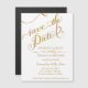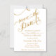 Elegant guld faux glitter på handskrivet manusskrivande kalligrafi som skrevs av Audrey Jeanne Roberts med mängder av snurrar, scrollsar och blomningsfärger skjuter av ord, Spara datum. Enligt typografin stil förlovning ska familj och vänner till sparan vara närvarande vid ceremonin i giftermål, datum, ort och bröllop. Upphovsrätt alla höger förbehållna.