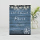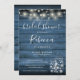 Ett Rustic inbjudningskort för möhippan med söt string ljus och Mason burk med snyggt script typography, på en blå, rustik träbakgrund. Designad av Thisisnotme©