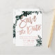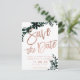 Skriptet ro guld grönt löv grönenery white sparar datumet för inbjudan till bröllopsinbjudan. Skicka datumkortet med den här eleganten faux ro guld typografi med vattenfärgen grönt löv blad på vit bakgrund, perfekt för chic stil bröllop