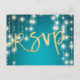 Bröllop OSA Svara vykortsmallar - Elegant Faux Gold Foil OSA Lettering Script och Vintage String Ljus med Turcos Blue Glitter Gnistra Background. En Perfekt för din stora dag! Alla textstorlekar i Stil, Färg kan anpassas efter dina behov.