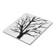 Svart och vit lino utskrift av en autumnal träd silhouette.