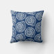 Dekorativ kudde i ett tryckt block mönster, baserat på ett årstidsskal för spiral, i vitt på en koboltblå bakgrund