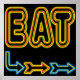 EAT-återförebild baserad på en vintage, nyrestaurang. Brev är gult och rött, pilarna är blå, röd och gult. Roligt, funky reklamkonst för människor som lagar mat eller äter.