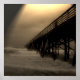 En unik syn på Flagler Beach-piren i Florida. Ett vackert svart och vitt foto med ett ljus som lyser ovanför piren är unikt och skulle se underbart hängande ut i ditt hem eller på ditt kontor.