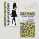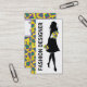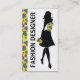 Mode-designerflicka med gult lila grönt panther skriver ut affärskort som fångar upp öga, med en modern mönsterflicka i svart med pander/leopard, överst och handväska i gult, lila, grönt på vit bakgrund och ett mönster-band. Ett kort för snyggt, elegant, trendig för en designer, konsult, boutique-ägare, en mode eller för mode show och för alla industriföretag i mode fält. Lite inslag från vectorportal.com.