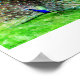 En manlig påk sprider ut sina fjädrar från svan för att visa dem i en trädgård.