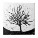 Svart och vit lino utskrift av en autumnal träd silhouette.