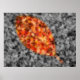 Ett selektivt höstfoto i färgaden av fallna kräpmyrtelösa löv, med en guld-framtagen löv-form av klarrött, orange och gult mot en svart och vit bakgrund.