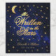 En marin och guld-design för ett celestial bröllop med temat "Den är skriven i Stars". Texten är omgiven av måne och stjärnan på en stjärnblå nattblå bakgrund. Måne, stjärnorna och titeln är faux guld, resten av texten är gyllene. Rubriken och namnen brid och groom skrivs i ett kalligrafiskt skript för elegant. Fotot från stjärnnatten är av Felix Mittermeier från Pixabay och det är gratis för kommersiell använda.