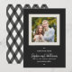Snyggt Foto Spara datumkortet som innehåller ditt foto omgivet av ett gräns, under vilket orden "Spara datum" i en skrivmaskin som typsnitt och parets namn i skript i ett benvitt färg mot mörkens grått bakgrund. Kortets baksida har överlappande mörk grått linjer mot en benvit bakgrund. Anpassa den genom att ersätta platshållartexten och ersätta exemplet/platshållarfotot med ett eget foto. Om du vill ha fler alternativ som att ändra teckensnittet och det är storlekt/färg eller mellanrummet mellan brev klickar du på knappen "Anpassa". *Observera att Zazzle Watermark som visas i zoomförhandsvisningen INTE visas på den färdiga tryckta produkten. © Rosewood and Citrus