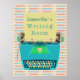 Den här söt väggen poster design för kreativets författare/författare/journalister och alla andra författare har en söt smart aqua blue typewriter teckning på den. Vintage 60-talet - skrivmaskinen i stil har ett hjärta i mitten och dess papper säger: "[Ditt namn]'s Writing Room". Bakgrunden har en lätt bläck-penna som upprepar mönster med en vattenfärg/målad effekt. Det här är ett sött, modernt, poster som kommer att se vackert ut på väggarna på alla livliga författarkontor.