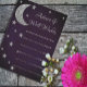 Skrivs i möhippan med stjärnor. Silver måne och stjärnor mot mörken vid midnatt lila