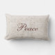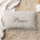En vacker beige kudde med "Peace in mörk brunt" och en bakgrund med antika skript.