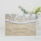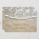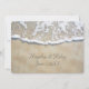 Skrivna i sanden, namn av paret lycklig på stranden eller på destinationsbröllopsinbjudan med en våg som tvättar i land.