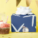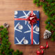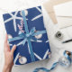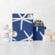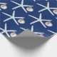 Tungblått, tropiskt julomslag pappert med stora stjärnfiskar och prydnadsföremål mönster. Vita, femålade havsstjärnor med en silver vit träd-dekoration hängande från ett ben, tryckt över mörk blått presentförpackning av hög kvalitet. Välj anpassningsbarnas rulllängd.