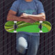 Skateboard som visas i ett kalkgrönt och grönt färg abstrakt-grafikutskrift. Färg Lime, Grönt, Guld med gnistor Köp som det är eller anpassa det här objektet efter dina önskemål. Lagrar-bild