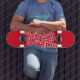 Skateboard som visas i ett massivt färg med rött med ett färgat svart och vitt snurrande bildtryck. Köp som det är eller anpassa det här objektet enligt dina önskemål.