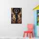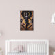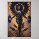 En gudomlig gestalt som förkroppsligar dualiteten mellan ljus och mörker. Med imponerande vingar och en gyllene gloria höjer hon svarta cirklar som bärare av hemligheter, medan flammande blad växer fram från hennes ben, vilket symboliserar återfödelse. Paletten av svarta och gyllene toner skapar en mystisk och kraftfull atmosfär, perfekt för dem som söker ett konstverk som samtalar med mytologi och andlighet. Idealisk för utrymmen som värdesätter drama och symbolism, förvandlar detta verk väggar till portaler till urgamla legender, och inger beundran och eftertanke.