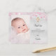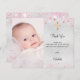 Ett modernt och elegantens baptism tack vare ditt kort. En faux silver metallisk tittar bakgrund som dekoreras med rosa faux glitter stoft. Anpassa och lägg till ditt foto av barnet, tackkortet och namn.