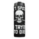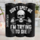 Denna edgy grafik har ett mänskligt skalle med en barbell i munnen, omgiven av fet, tryckt text. Konstruktionen omfattar mörken och den humoristiska slogan "DON'T SPOT MIG I'M TEYING DIE", som skapar ett tydigt och rebellöst påstående biet för viktning.