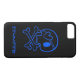 Ett neonblått skalle och korsbensillustration med hjärtformade ögonepatch. Svart bakgrund. Anpassa med din egen namn.