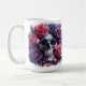 En utförlig illustration av ett mänskligt skalle med levande rosa och lila ro, som symboliserar en blandning av skönhet och dödlighet, som ställs mot en konstnärlig bakgrund av abstrakten.