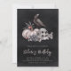 En skämtduk chic Halloween födelsedagsfest inbjudan för barn eller vuxnor med skalle, ben, gotblommor och en korv sitta sätter upp en vit pumpkin på en rök svart bakgrund. Anpassa den här unika eleganten Halloween födelsedagsfest inbjudan med din händelseinformation nedan.