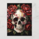Med vykort kan du se vattenfärgsgrafik i en skalle omgiven av röd ros mot en svart bakgrund. Den här morbida mörken är underbar när som helst, men särskilt den spooky Halloween-säsongen.
