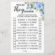 Blå blommor Skulle de hellre ha Bröllopsduschspel. Ändra texten till designen. För ytterligare anpassning (ändra fråga och annan text, typsnittsfärg, typsnittsstil), klicka på Anpassa, scrolla ned och klicka på länken "klicka för att anpassa ytterligare". HUR MAN SPELAR: Gästerna kryssar i det val de tror att bruden och brudgummen skulle välja