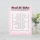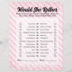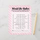 Fördjupa din fest med vår "Skulle hon hellre?"-födelsedagslek! Denna underhållande aktivitet utmanar gästerna att gissa vad födelsedagsflickan föredrar i olika scenarier. Från att välja mellan att sova länge eller stiga upp tidigt, till att välja pepparonipizza framför ostpizza, kommer detta spel garanterat att skapa samtal och skratt. Personen med flest rätta svar vinner! Med en snygg design med rosa ränder och glitteraccent, kompletterar den perfekt ditt festtema. Dessutom är alla alternativ helt anpassningsbara för att göra spelet unikt anpassat till födelsedagsflickan. Perfekt för födelsedagar, shower och andra festliga sammankomster, kommer detta spel att hålla dina gäster engagerade och skapa minnesvärda ögonblick.