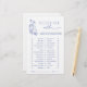 Öka din möhippa med ett "Skulle hon hellre?"-spel som blandar underhållning med enkel elegans. Med en tidlös utformning av en blå blommigt illustrerade detta vackert inbjudan-gäster för att gissa vad brud-to-be föredrar - från Paris eller Rom? Champagne eller cocktails? - på ett lekfullt men sofistikerat sätt. Perfekt för möhippa brunches, te party eller elegant soirées. Det här interaktiva spelet ger en förfinad beröring till festligheterna samtidigt som gästerna hålls insatta. Koppla ihop den med matchande inbjudningar, menyer och dekorera för en sömlöst samordnad händelse. Om du vill anpassa, kan du redigera färg eller personligen genom att kontakta designern. Copyright Anastasia Surridge, alla höger reserverade.