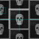 Skullhuvud Gothic Black and white grunge spooky craft sewing väv. Coola, trendig, modernt, läskigt, Halloween konstmaterial av mönster. Grått struktur gräns runt varje kvadrat. Bilcopyright Marg Seregelyi Fotografi.