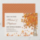 Anpassa dessa vackra hösttema-tack-kort och bröllopsannonser med datumet för ditt kommande bröllop. Ett vackert träd med hjärtformade blad kan personifieras med brudens och brudgummens initialer på framsidan av dessa annonser. Orange hjärtrygg. Bild © Chrissy H. Studios, LLC. Alla rättigheter förbehållna.