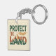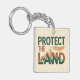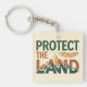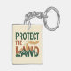 Denna djärva, miljövänliga nyckelring har frasen "SKYDDA LANDET" med ordet "LANDET" som innehåller en slående bergskedjeillustration. Designen använder en högkontrastfärgspalett av djupgrön, roströd och guld. En detaljerad, linjär fjäder svävar ovanför designen och lägger till ett kraftfullt, ursprungsbefolkningsinspirerat element.
