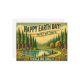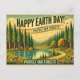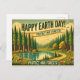 Här är vintage-stil-resevykort för Lycklig Earth Day, med en kuperad skog med högt gräs träd, en spirande vandring och ett fredligt sjö. 🌿 🌎 Utformningen har fallit, sol blekt färg med återtypografi som lyder "Skydda våra skogar!".
