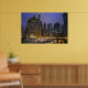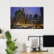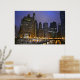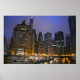 Titta ner i Chicagofloden vid dusk med det höga byggnad som skjuter upp och tänder upp natten.